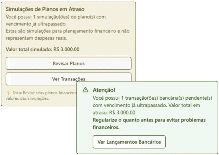 Você recebe alertas inteligentes sobre vencimentos de contas e projeções de saldo negativo, para se organizar antes que os problemas aconteçam.