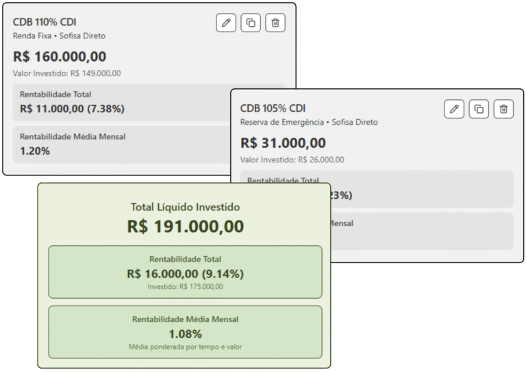 Seja em CDBs, reservas de emergência ou outros ativos, o Monedo organiza tudo para que você saiba exatamente quanto está crescendo o seu patrimônio.