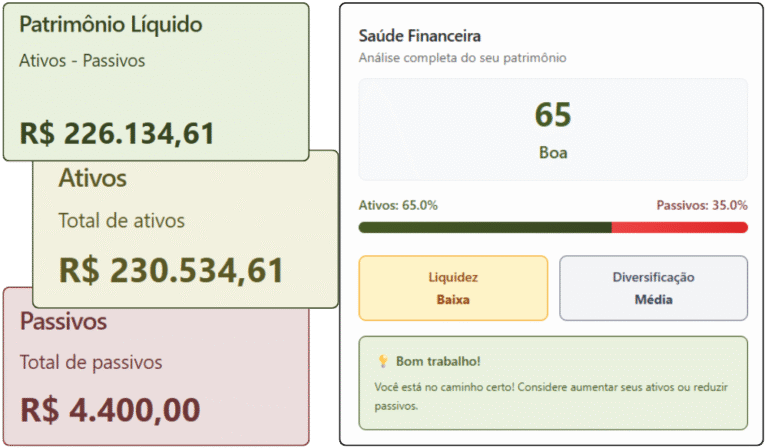 Com o Monedo, você acompanha de forma simples e automática quanto realmente possui — seus ativos, passivos e investimentos. Assim, entende sua saúde financeira de verdade e toma decisões como quem sabe construir riqueza de longo prazo.