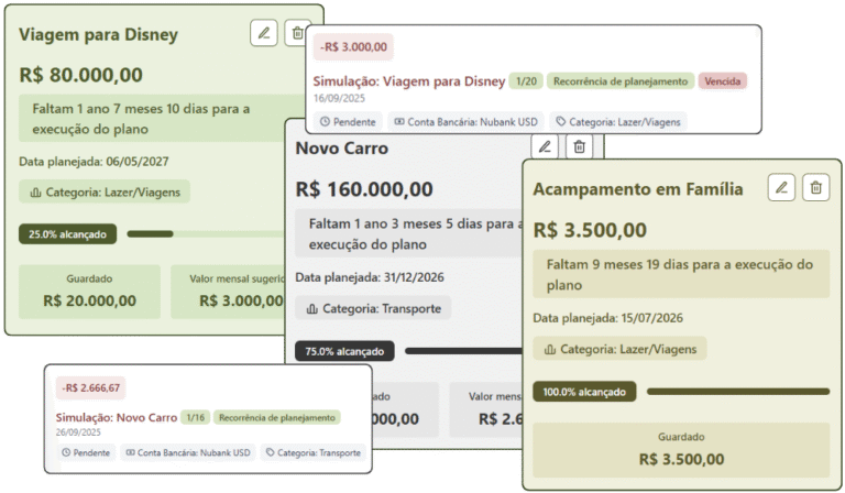 Com o Monedo, você não apenas organiza suas finanças: você transforma sonhos em metas reais. A ferramenta de planejamento automático simula seus gastos dentro do plano de contas e sugere quanto guardar mês a mês para alcançar seus objetivos.