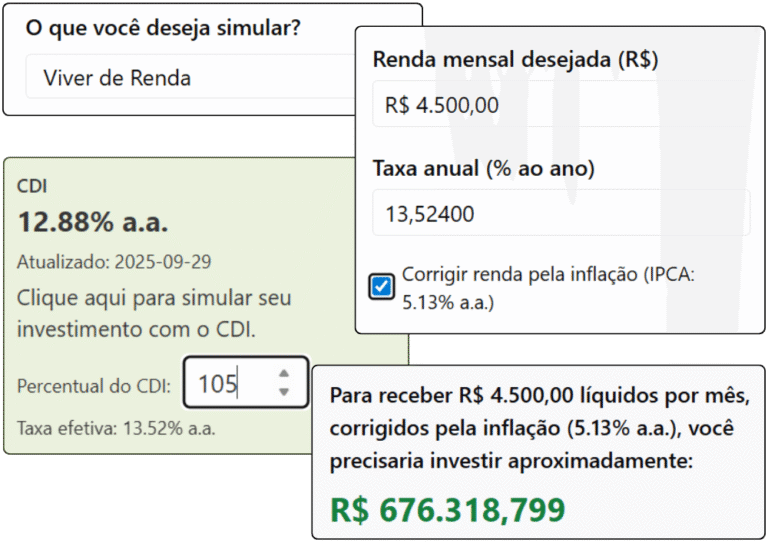 O Monedo simula quanto você precisa acumular para viver apenas dos seus investimentos, garantindo uma renda mensal desejada, já corrigida pela inflação.