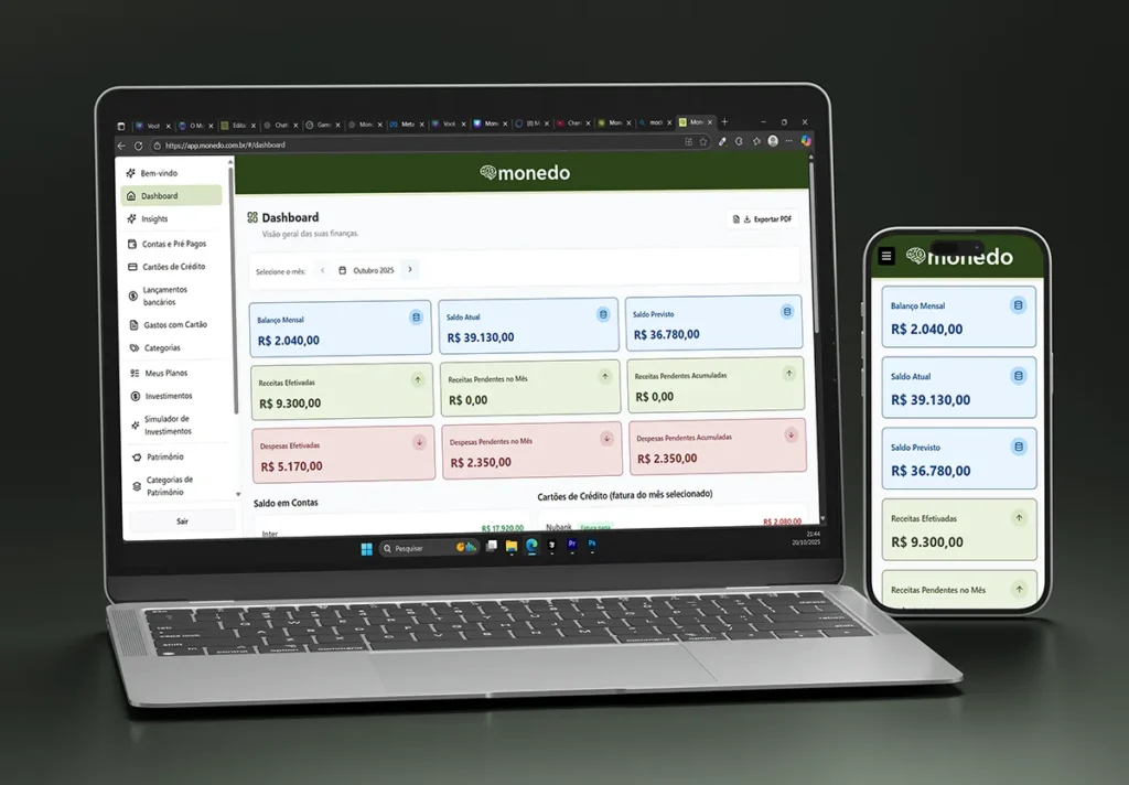 O acesso é 100% online. Basta entrar no navegador pelo computador, tablet ou celular. Como o Monedo é um webapp, você pode usá-lo de qualquer lugar, sem precisar instalar nada.